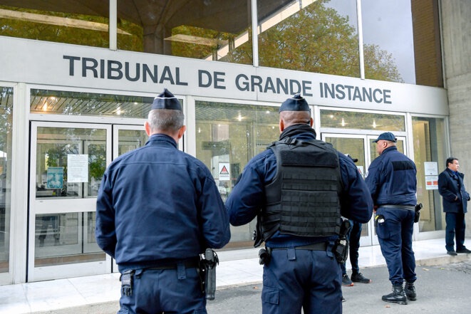 Des policiers devant le tribunal correctionnel d’Évry, le 15 octobre 2019. © Photo Bertrand Guay / AFP