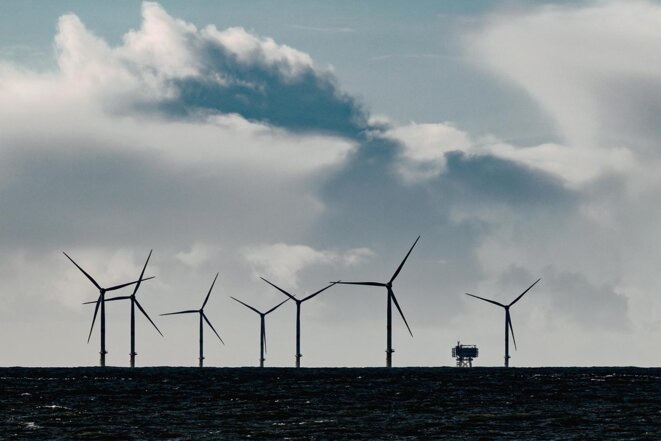 Le parc éolien offshore de Saint-Nazaire (Loire-Atlantique), au large de la presqu’île de Guérande, à Batz-sur-Mer, en 2025. © Photo Jérôme Gilles / NurPhoto via AFP