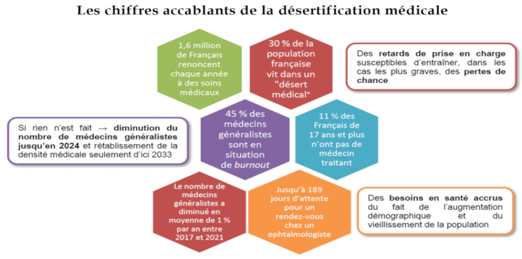 Aujourd’hui en France, il y a 230 000 médecins en tout, dont 99 500 généralistes et 130 000 spécialistes (chiffres de la DREES) pour 68 millions d’habitants. Soit 1 médecin pour 300 habitants en théorie (1 pour 700 si on réduit aux généralistes). Pourtant 1/3 des Français vivent dans des déserts médicaux (source : Sénat, 2022) dont entre 7 et 9 millions sans médecins traitants, et parmi eux 500 000 en ALD (maladies chroniques), à l’heure où les besoins vont croissant puisque la population vieillit, et que les maladies chroniques sont en préoccupante augmentation, affectant 36% de Français en 2023. Or, entre 2021 er 2028, une baisse continue du nombre de médecins est à prévoir, faute d’avoir été anticipée. Le retour au niveau de 2021 est prévu pour… 2036. En attendant, une décennie noire attend les Français, avec l’abandon sanitaire de bassins de populations entiers. Sauf si des mesures courageuses sont prises par le Gouvernement – ce qui n’est pas le cas aujourd’hui.