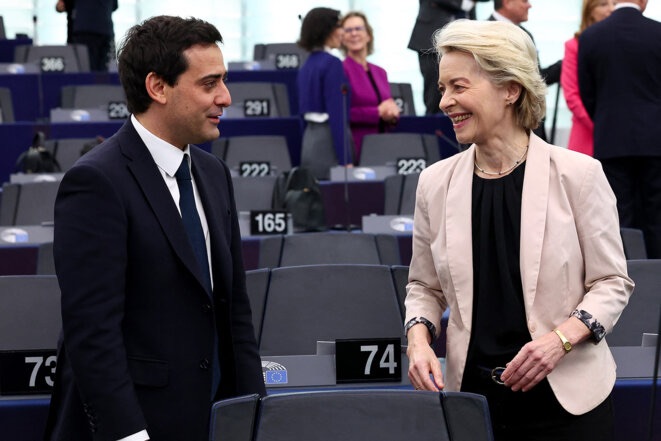La présidente de la Commission européenne, Ursula von der Leyen, et Stéphane Séjourné au Parlement européen, le 27 novembre 2024, à Strasbourg. © Photo Frederick Florin / AFP