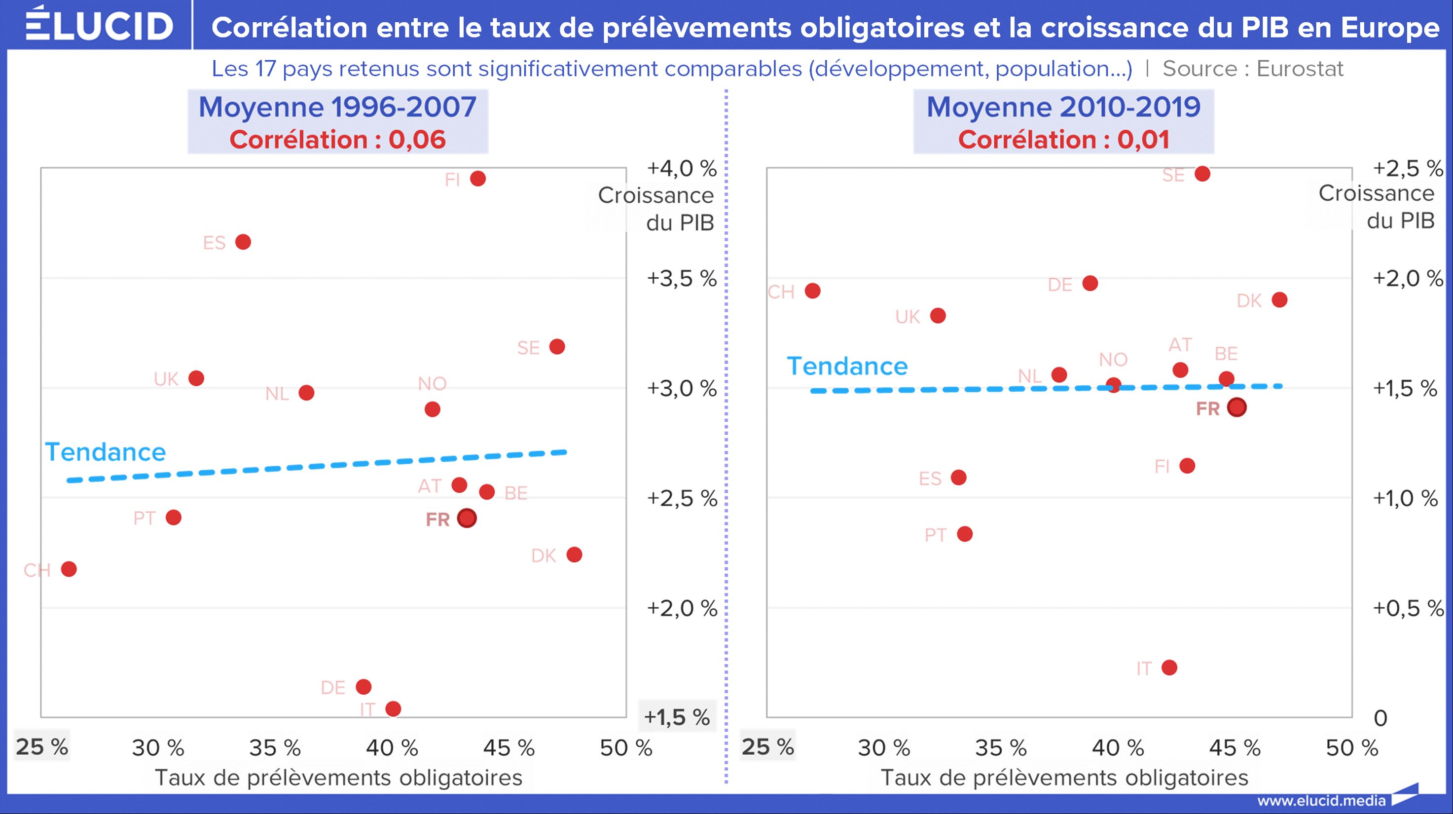 Si l’on observe froidement la croissance économique d’une quinzaine de grandes puissances européennes sur le temps long – en excluant les bruits statistiques des crises majeures – un constat s’impose : il n’existe strictement aucune corrélation significative entre le taux de « pression fiscale » et le niveau de croissance du PIB.