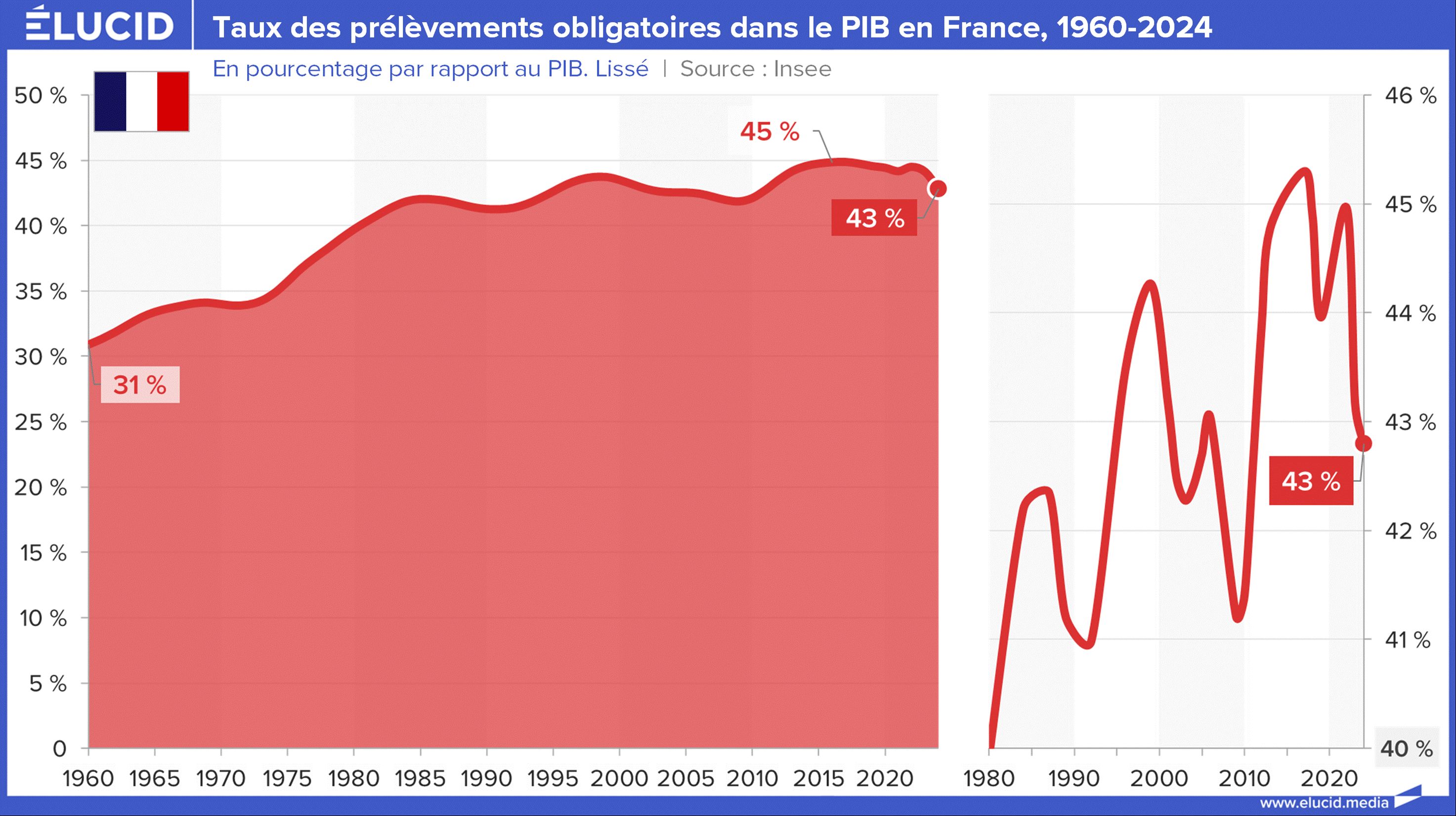 Mais il faut impérativement tordre le cou à l’idée reçue d’une dérive récente. En réalité, le taux de prélèvement n’a plus augmenté structurellement depuis le milieu des années 1980. La véritable ascension a eu lieu durant les Trente Glorieuses : +5 points dans les années 1960, +5 points dans les années 1970, en raison du développement de la Sécurité sociale.