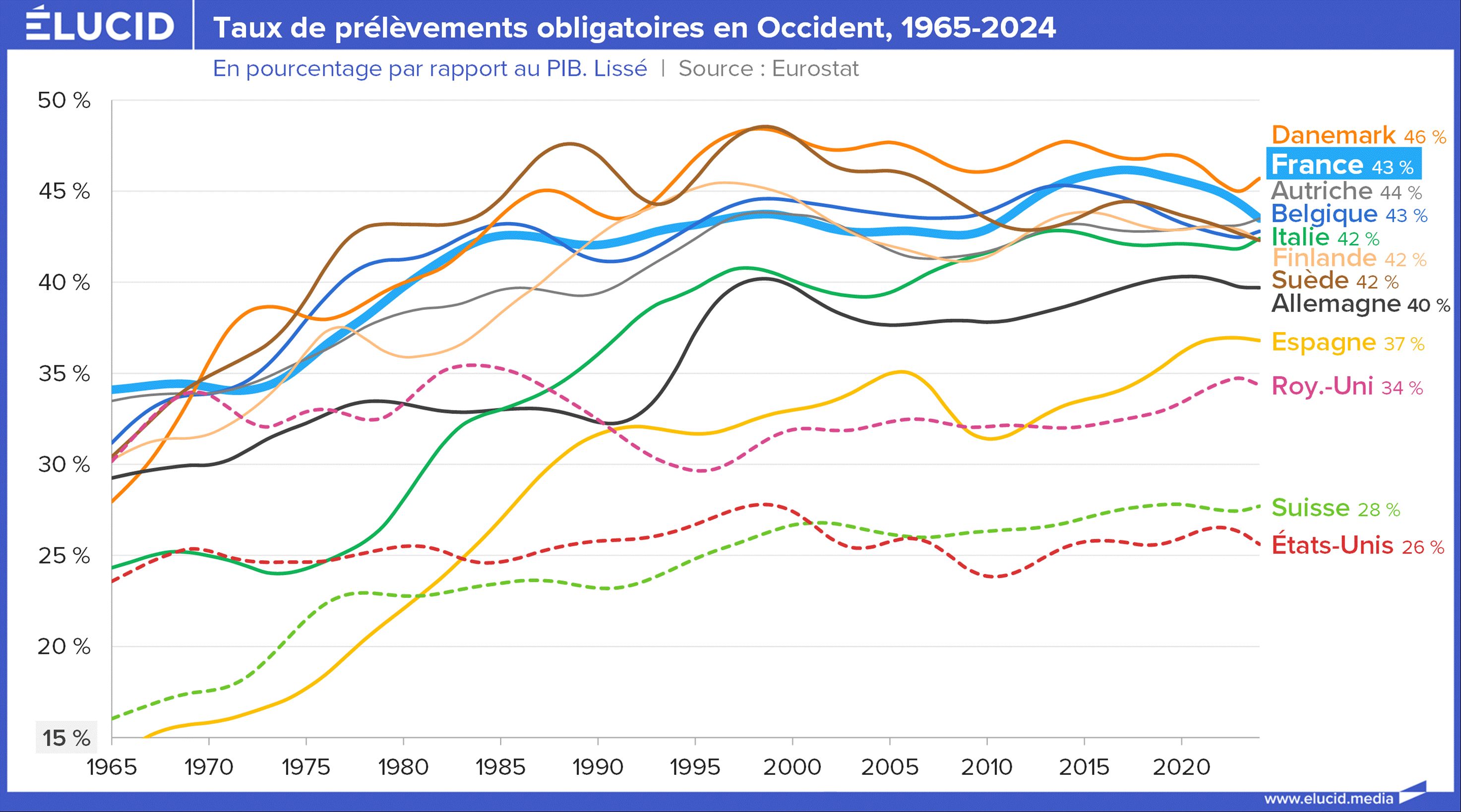 Le récit médiatique dominant décrit la France comme un « enfer fiscal » asphyxiant l’économie. Cette vision relève de la propagande. En réalité, le taux de prélèvements obligatoires (43 % du PIB en 2024) est stable depuis le milieu des années 1980. L’augmentation historique date des Trente Glorieuses, période de forte croissance, pour construire notre système social. La France n’est pas une anomalie isolée : elle se situe dans la moyenne haute européenne, proche de pays comme l’Autriche, la Belgique ou le Danemark, qui ont fait, comme nous, le choix de la socialisation des risques.