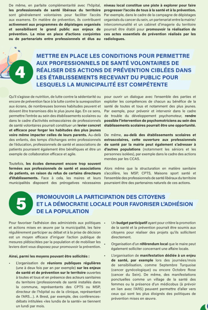 De même, celle-ci joue un rôle essentiel pour promouvoir des environnements favorables à la santé et, plus généralement, la prévention en santé. Face aux inégalités sociales de santé, à la montée des maladies chroniques et aux défis environnementaux, les communes et intercommunalités sont incontestablement des acteurs structurants du parcours de santé et de prévention des citoyens. Si la planification de nos politiques de santé est avant tout une prérogative régalienne, la municipalité est l’échelon le plus proche des préoccupations des citoyens et dispose donc de moyens d’action dont l’impact peut être immédiat sur leur vie quotidienne, en améliorant les comportements favorables à la santé et en promouvant un environnement sain.