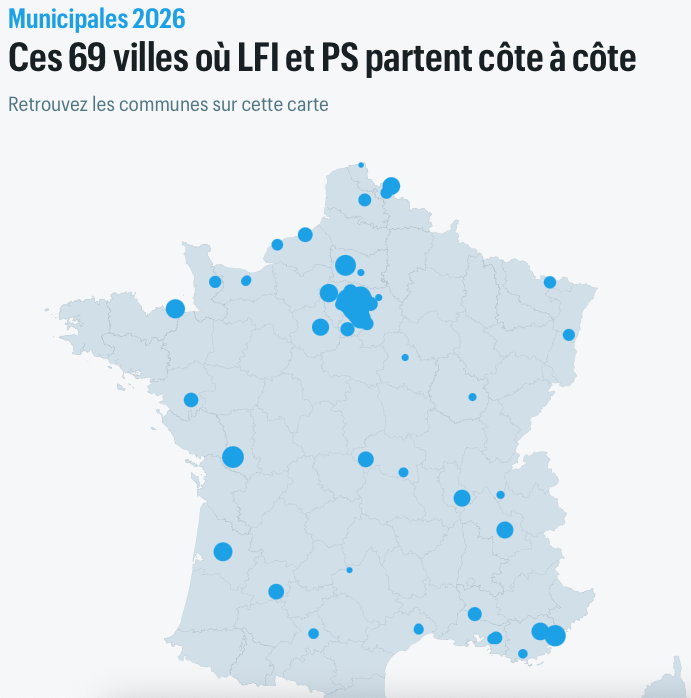 Le Parisien a comptabilisé au moins 69 villes où les socialistes et les insoumis partiront côte à côte le 15 mars, la plupart du temps dans des listes sans étiquettes ou face à une forte extrême droite localement.