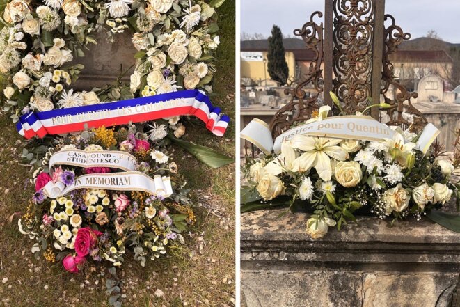 Une gerbe en hommage à Quentin Deranque le 3 mars 2026, à Cucuron (Vaucluse). © Photo Marie Turcan / Mediapart