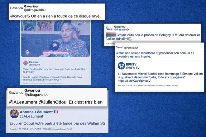 Plusieurs posts sur X de Quentin Deranque sous pseudonyme. © Photomontage Mediapart