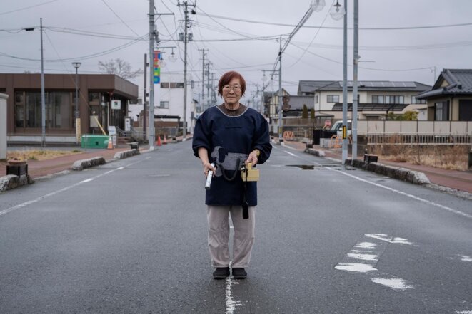 Tomoko Kobayashi, propriétaire d’un riokan et membre d’un réseau de citoyens mesurant la radioactivité. Elle tient un compteur geiger dans la rue principale d’Odaka. © Photo Arthur Perset / Hans Lucas pour Mediapart