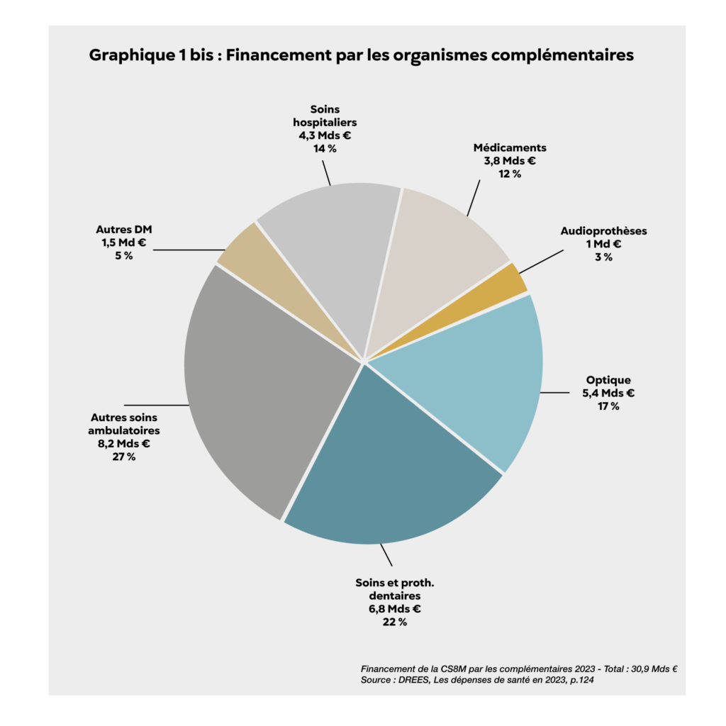 Le financement de la Consommation de soins et de biens médicaux (CSBM)2 par les organismes complémentaires s’élevait à 30,9 milliards d’euros en 2023 et les trois postes du 100 % santé en représentaient plus de 40 % : 22 % au titre des soins et prothèses dentaires, 17 % au titre de l’optique médicale et 3 % au titre des audioprothèses [Graphique 1 bis].