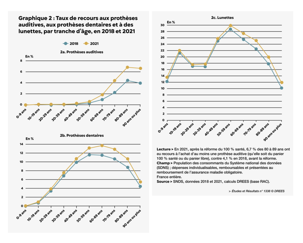 En 2021, 4,1 % des 70 à 79 ans ont acheté un équipement en audiologie, contre 2,2 % en 2018 (soit une augmentation de 83 %). Pour les 80 à 89 ans, ces taux s’élèvent respectivement à 6,7 % en 2021 et à 4,1 % en 2018 (+64 %). Le recours aux prothèses dentaires augmente plus faiblement » [Graphique 2].