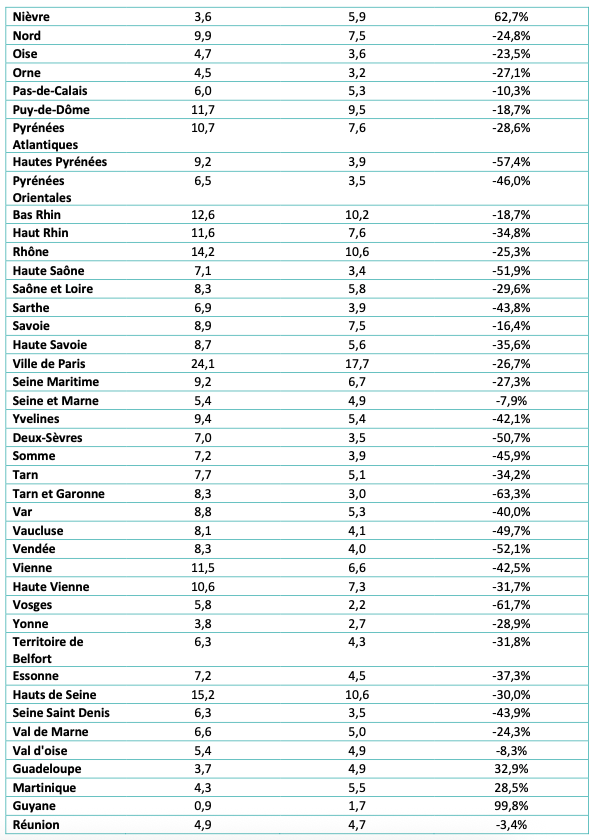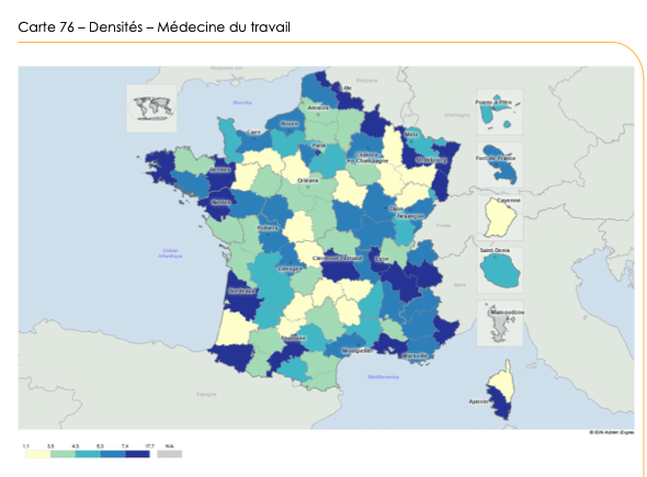 Le déficit de ressources en médecins du travail n’est pas homogène sur l’ensemble du territoire, certaines zones apparaissant particulièrement plus touchées (gradient de la carte ci-dessous de 1,1 à 17,7)