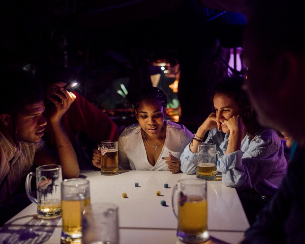 Au bar-restaurant Salsa Rio, de jeunes Cubains jouent aux dés, éclairés à la lumière d’un téléphone, lors d’une coupure d’électricité, à La Havane, le 3 janvier 2026. LUCIEN LUNG/RIVA PRESS POUR « LE MONDE »