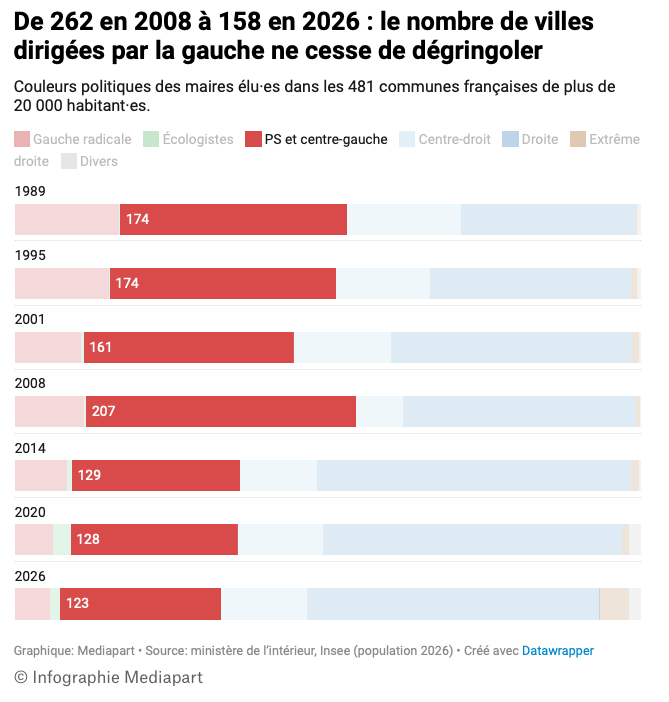En tous les cas, à l’échelle des villes de plus de 20 000 habitant·es, la gauche reste en 2026 à un niveau inférieur à celui de 2014, lequel était déjà un point historiquement bas au cœur du désastreux quinquennat Hollande. On observe au niveau local ce qui reste vrai au niveau national : l’ensemble de ce camp ne s’est toujours pas remis de cette mandature. Au demeurant, « certaines campagnes victorieuses des socialistes, comme à Saint-Étienne ou Amiens, ont été menées sur une tonalité très centriste », note Rémi Lefebvre.