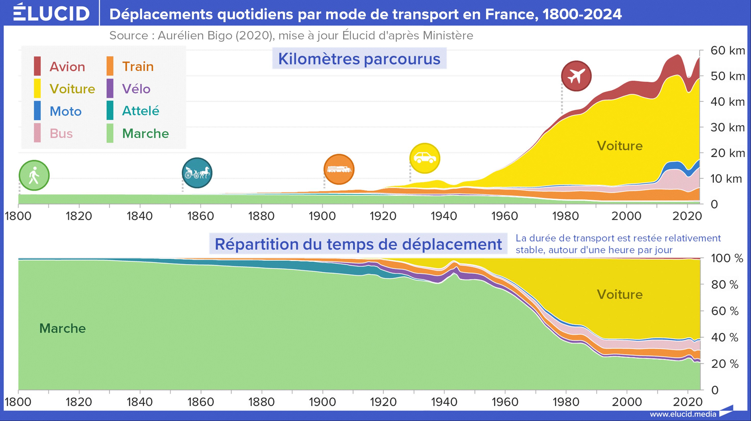 Jusqu’aux années 1950, les déplacements humains se faisaient essentiellement à pied et parfois à cheval, ce qui les cantonnait à des trajets strictement locaux. Depuis, les choses ont radicalement changé, mais comme le rappelle le chercheur Aurélien Bigo, trois grandes caractéristiques de nos déplacements sont restées remarquablement stables :