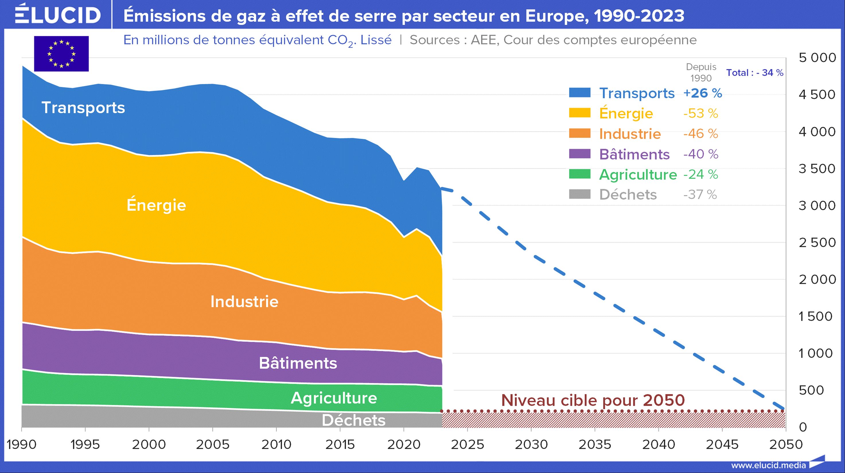 Les émissions de CO₂ en Europe ont diminué de près de 35 % entre 1990 et 2023. Ce sont les secteurs de l’Énergie (-53 %), de l’Industrie (-46 %) et des Bâtiments (-40 %) qui ont le plus réduit leurs émissions.