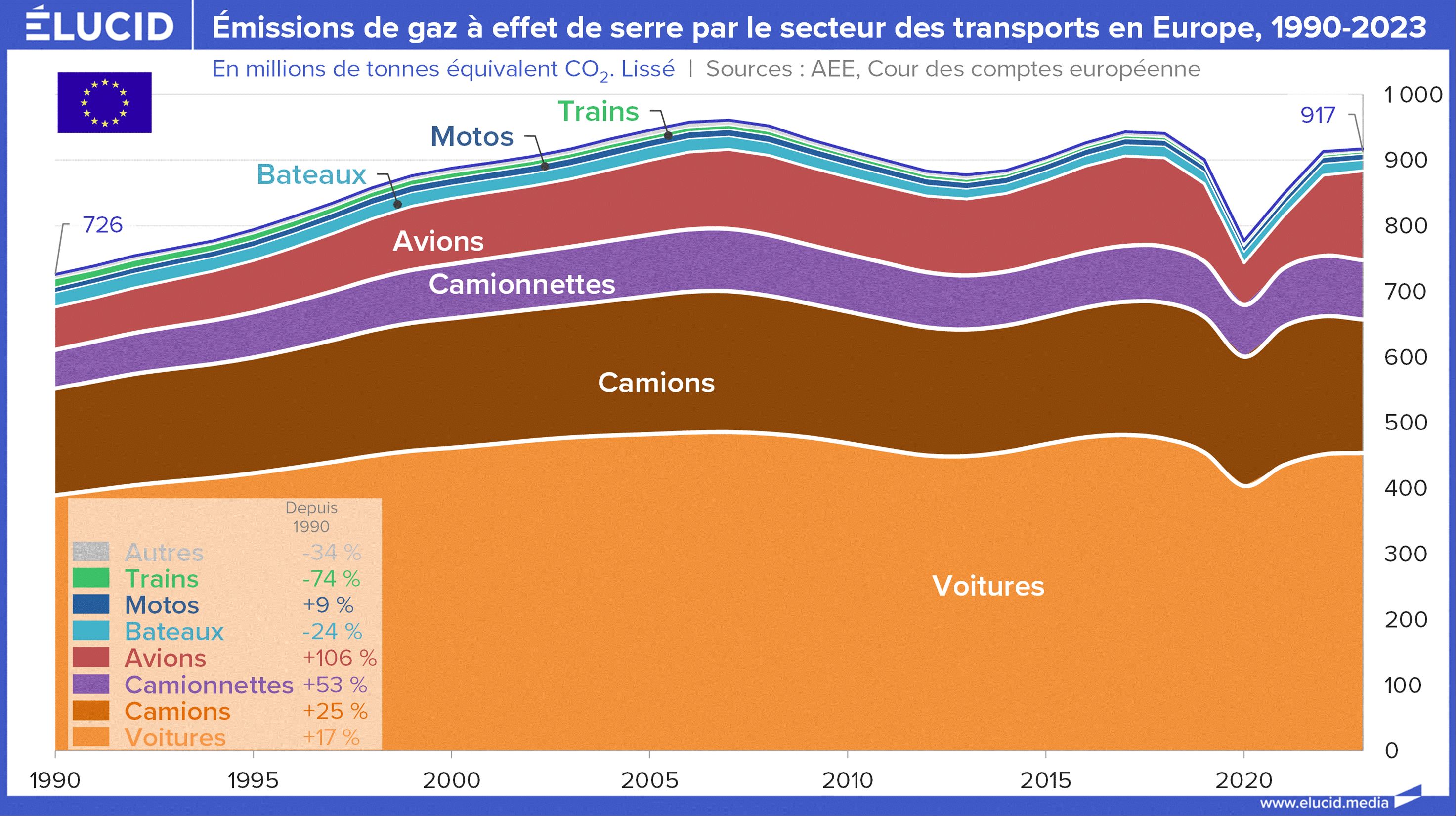 À contrario, un seul secteur a vu ses émissions augmenter : celui des transports, avec une hausse de +26 %, alors qu’il représente 25 % des émissions de l’Europe. Dans le détail, la plus forte progression concerne, et de loin, le transport aérien : +110 % d’émissions. Le seul avion, qui ne pèse que 10 % des émissions du secteur, a représenté plus de 30 % de leur hausse depuis 1990, soit presque autant que les voitures, qui en représentent pourtant la moitié des émissions. Vient ensuite le transport de marchandises par camionnettes et camions, avec +35 %, soit près de la moitié de la hausse totale du secteur. Plus anecdotiquement, le train a réduit ses émissions de 75 % : elles ne représentent plus que 0,5 % des émissions du secteur ; les émissions des trains pèsent désormais moins du tiers des émissions des seules motos.
