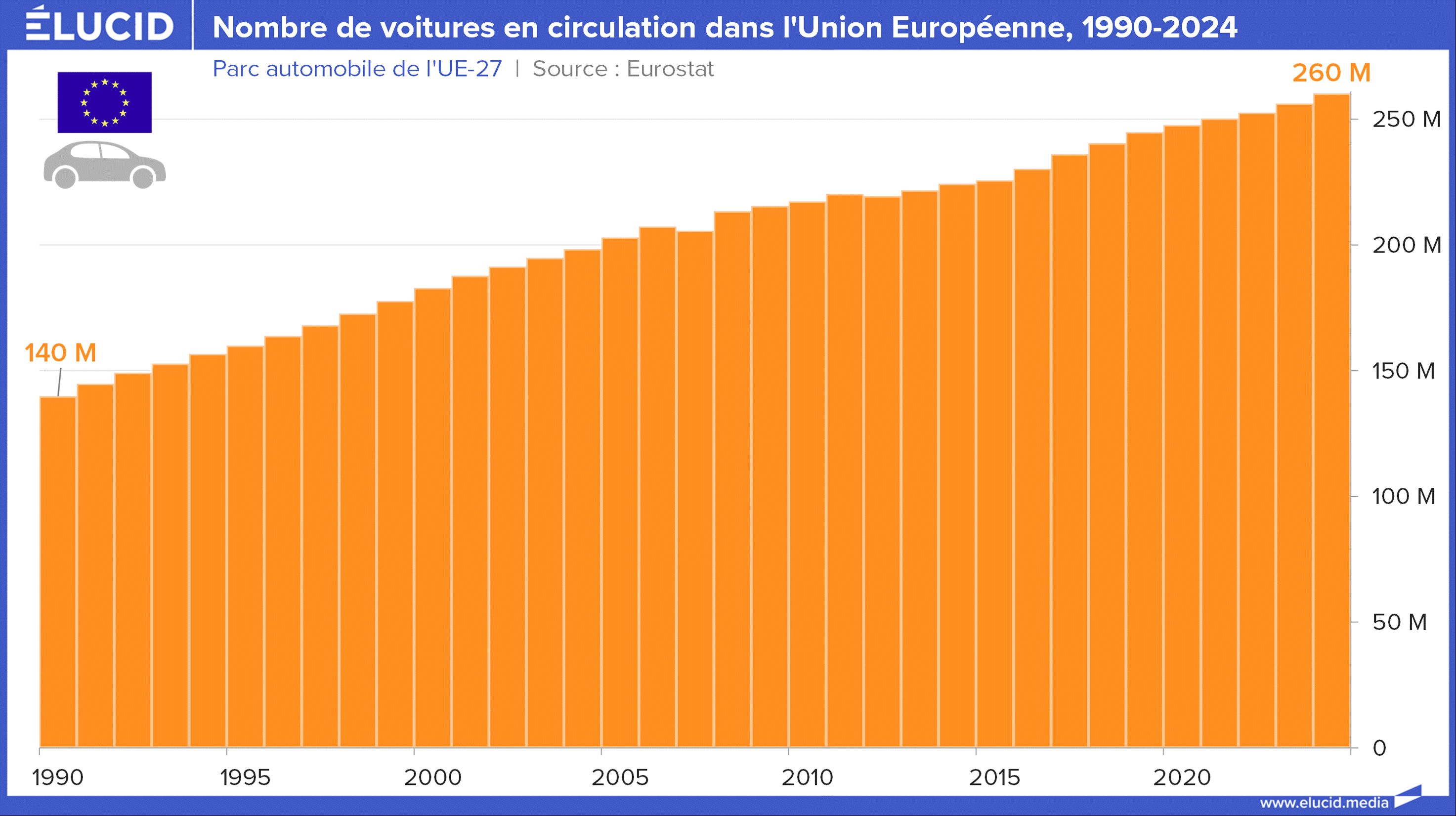 Un facteur majeur de cette hausse sectorielle est la progression des émissions des voitures particulières, en hausse de +17 % depuis 1990. La raison est simple : alors que l’Europe s’engageait à réduire fortement ses émissions, son parc de voitures en circulation a augmenté de 85 % depuis 1990 !