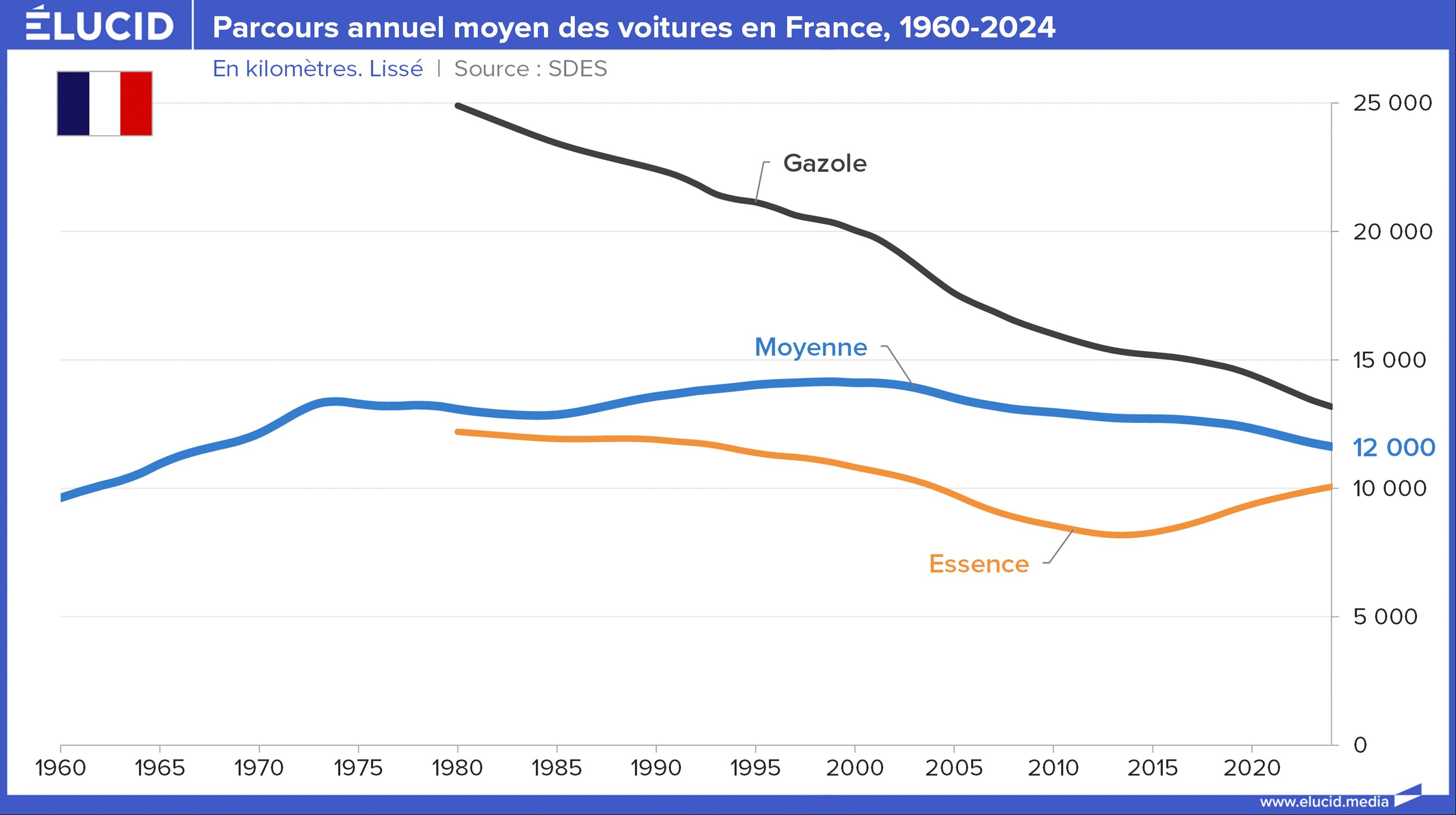 Si les émissions n’ont pas suivi la même trajectoire, c’est pour deux raisons principales. D’abord, la distance moyenne parcourue a diminué de 15 % depuis l’an 2000, pour atteindre environ 11 000 km par an en Europe en 2019 et 12 000 km en France.