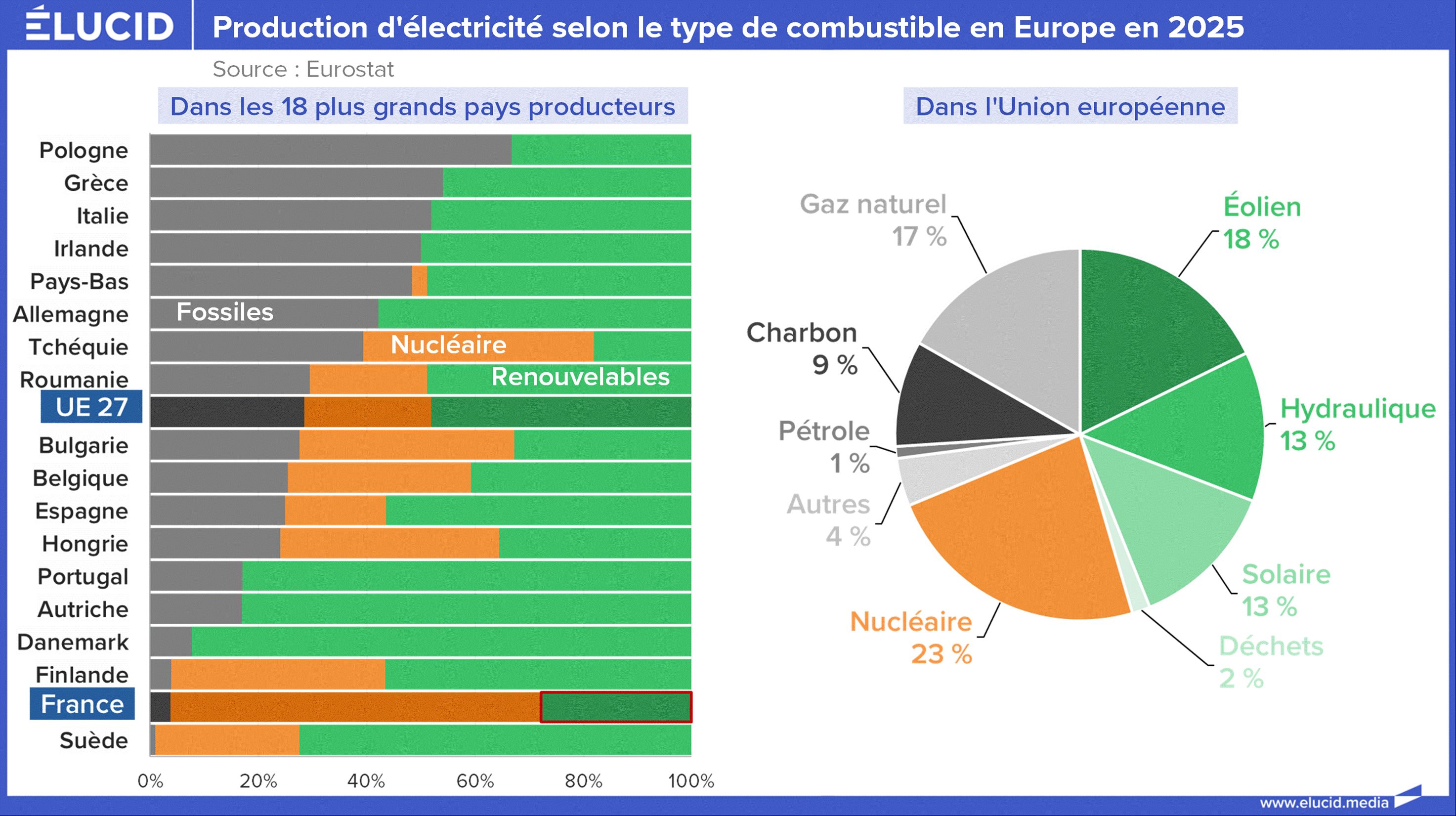 Les émissions au quotidien des VE dépendent aussi du mix énergétique utilisé pour la production électrique, qui, malgré des progrès réels, comprend encore un tiers de combustibles fossiles en Europe, et bien davantage dans certains pays comme la Pologne, l’Italie ou l’Allemagne. La bonne nouvelle est que la France produit très peu d’électricité fossile ; la moins bonne est qu’elle produit aussi très peu d’électricité renouvelable.