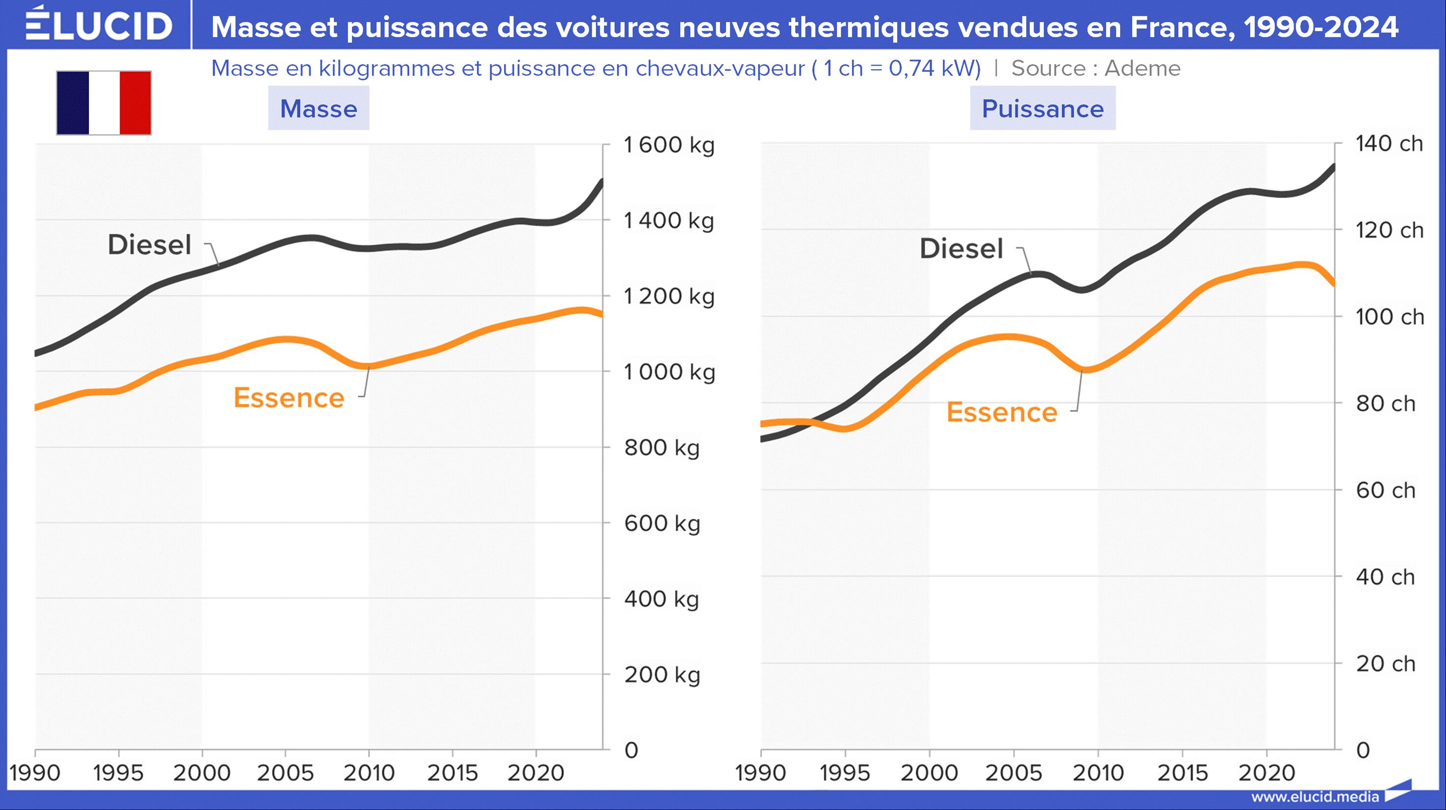Mais, via un effet rebond, ces gains ont été neutralisés par l’augmentation de la masse des véhicules et de la puissance des moteurs. La Cour des comptes indique en effet que « la masse moyenne des voitures a augmenté d’environ 10 %. Depuis cette même période [2010], la puissance des moteurs a augmenté de 25 % ». En France, le poids et la puissance des voitures thermiques ont augmenté de 30 % et 60 % depuis 1990, dont 10 % et 25 % depuis les mesures contraignantes de 2010.
