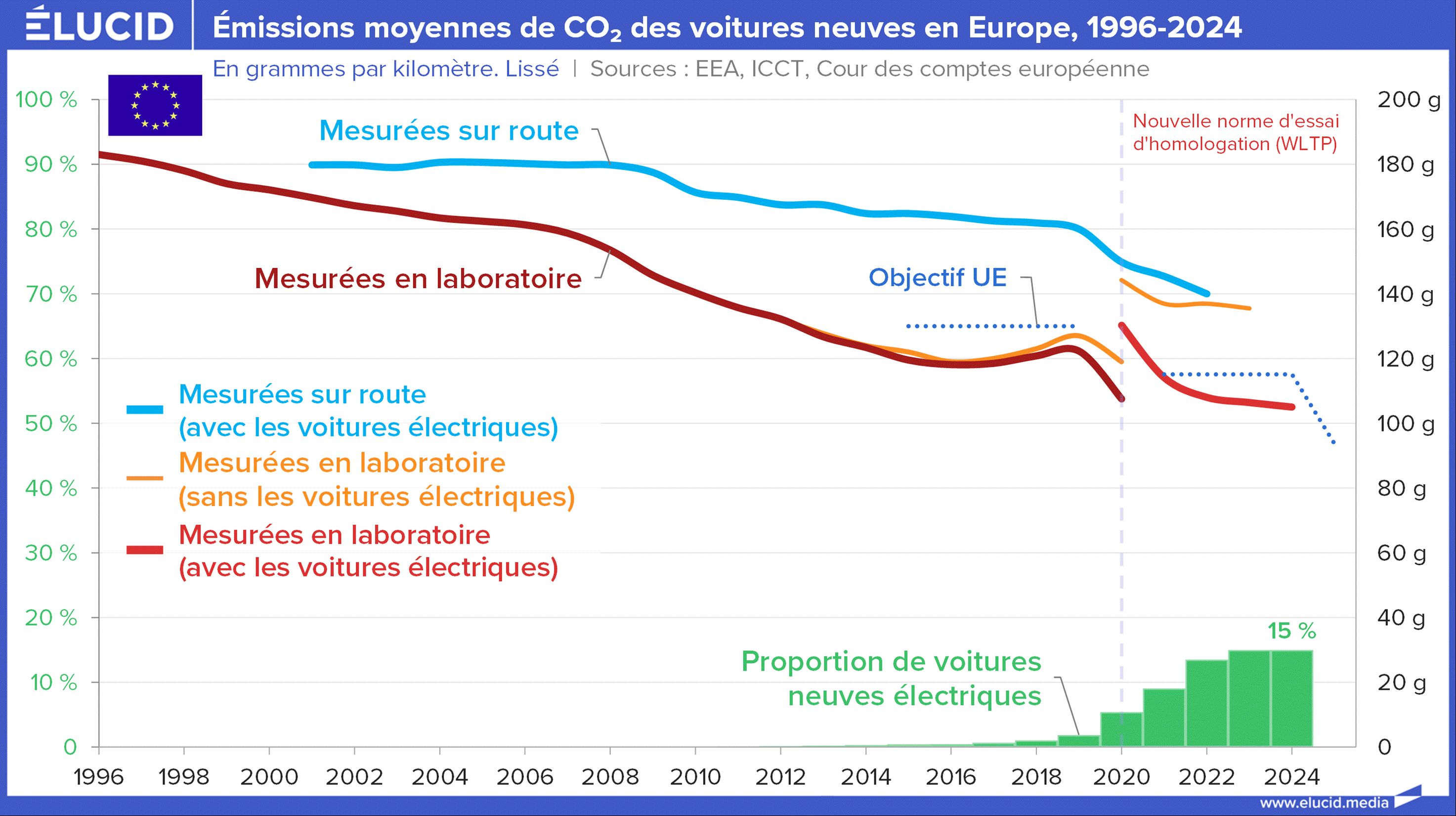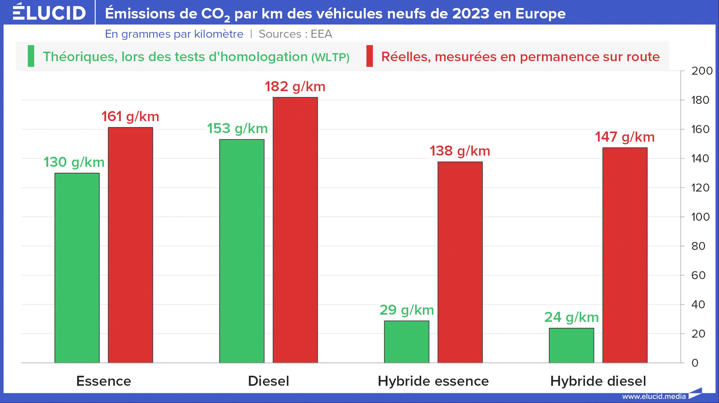 « Avant 2020, malgré l’existence du règlement sur les émissions de CO₂ des voitures particulières et le fait qu’après les trois premières années, tous les objectifs à l’échelle du parc de l’Union aient été atteints, les émissions de CO₂ en conditions d’utilisation réelles des voitures nouvellement immatriculées n’ont connu qu’une baisse marginale (moins de 7 %). Parallèlement, les émissions de CO₂mesurées en laboratoire ont chuté de 16 % […].