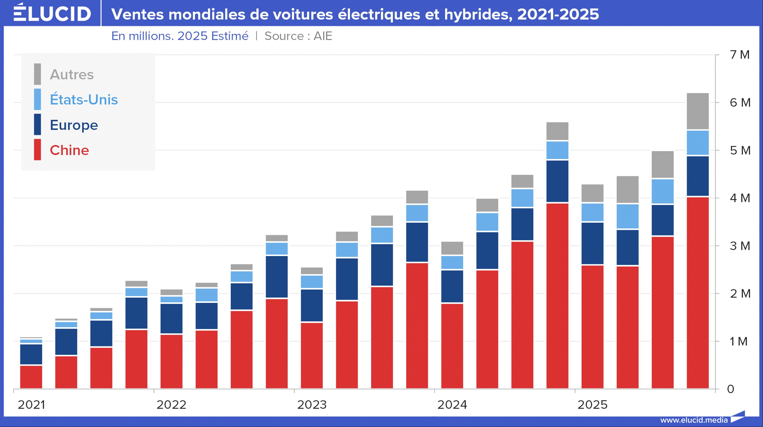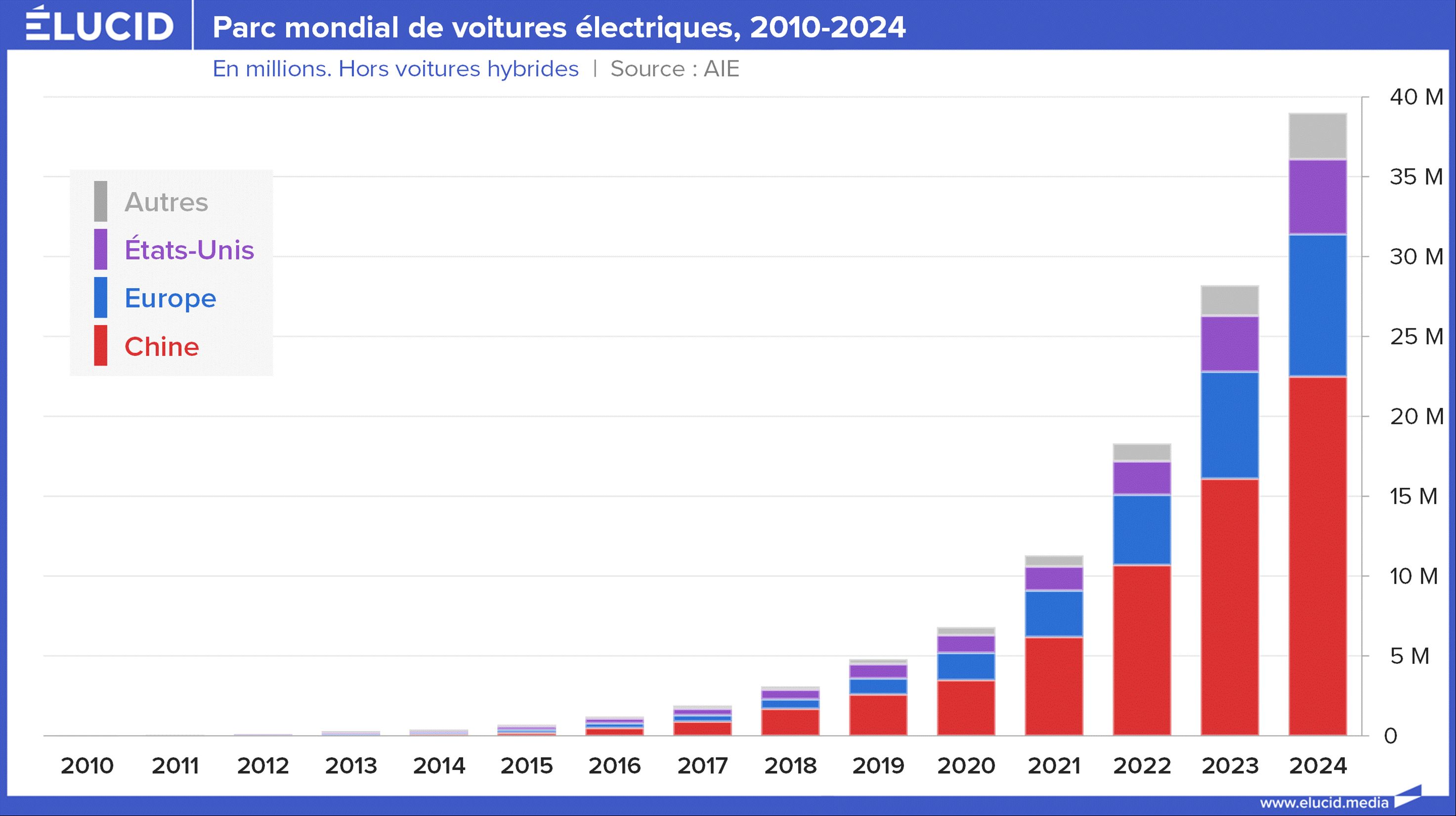 Si les voitures électriques continuent leur forte croissance au niveau mondial, c’est largement grâce au marché chinois, qui représentait à lui seul en 2024 environ les deux tiers des ventes de VE (y compris hybrides).