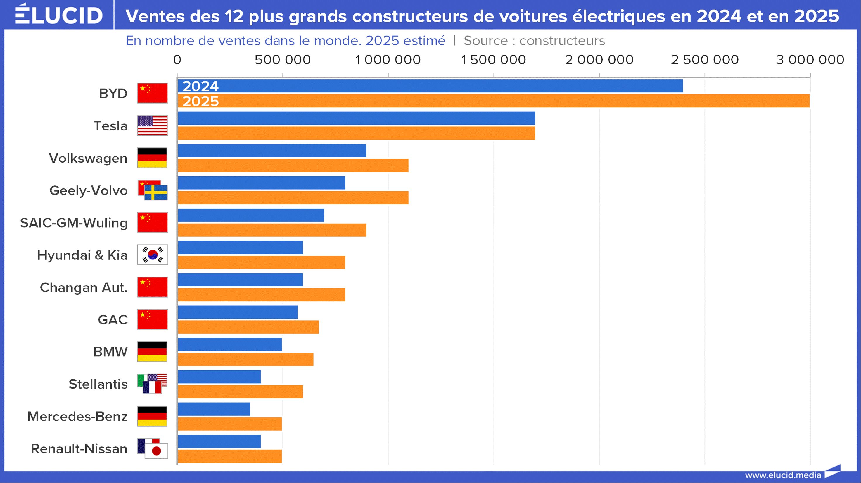 Résultat : les trois premiers constructeurs mondiaux de VE, qui se partagent plus de 30 % du marché, sont le Chinois BYD (fondé en 1995, entré dans l’automobile en 2003, 3 millions de VE soit 17 % des ventes mondiales), l’Américain Tesla (fondé en 2003, 1,7 million de VE en 2025 soit 9 % des ventes mondiales) et l’Allemand Volkswagen (fondé en 1937, 1,1 million de VE soit 6 % des ventes). Plus largement, 4 des 12 plus grands constructeurs de voitures électriques sont chinois.