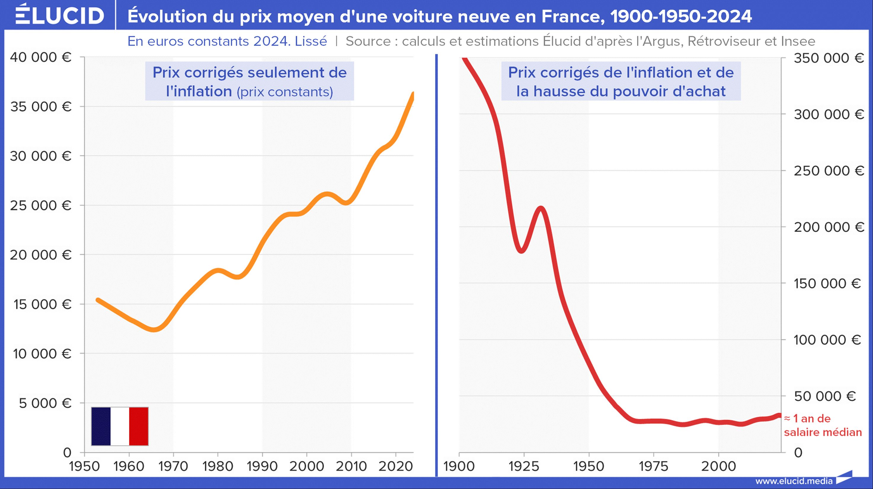 Le pouvoir d’achat a certes fortement augmenté sur la même période, et le prix moyen d’une voiture en proportion des revenus a finalement peu évolué depuis les années 1960. Il représente environ un an de salaire médian depuis lors, soit environ 30 000 € de 2024, en légère hausse depuis l’an 2000, en raison notamment des ventes de SUV. Pour mémoire, en 1900, une voiture coûtait l’équivalent de dix ans de salaire médian : c’est la division progressive de ce prix par 10 qui a permis la massification de l’automobile à partir des années 1950.