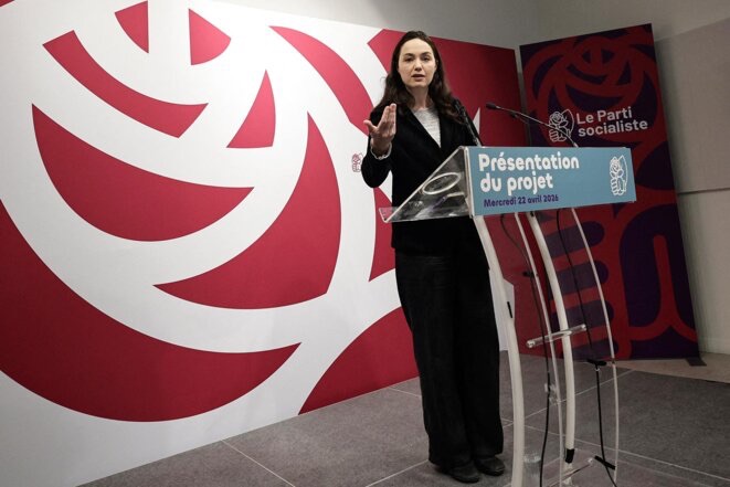 Chloé Ridel, coordinatrice du programme du Parti socialiste (PS) et députée européenne, présente le projet politique du parti au siège du PS à Paris, le 22 avril 2026. © Photo Stéphane De Sakutin / AFP