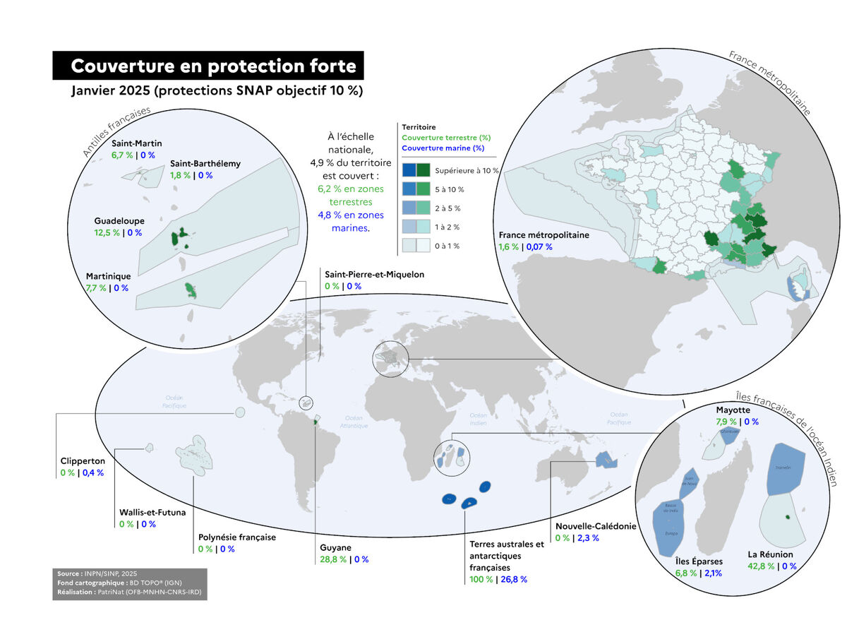 « À l’issue de la période 2021-2025, la France dépasse l’objectif de 30 % de couverture en aires protégées, atteignant 33,5 % du territoire terrestre et marin », établit le rapport. Cette progression est essentiellement due à l’extension de vastes espaces marins en outre-mer, notamment dans les Terres australes et antarctiques françaises.“ Cette ambition repose principalement sur le territoire de Polynésie française qui représente à lui seul près de la moitié du domaine maritime français ”Patrinat